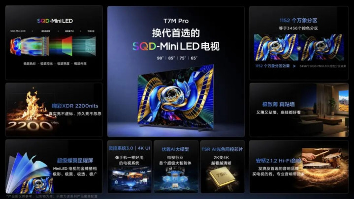 T7M Ultra定位为“客厅的第一台SQD-Mini LED电视”,提供65/75/85/98英寸采选,面向家庭用户。该家具搭载最多2176个分区,分区数相配于市面上6528个分区的RGB-Mini LED电视,复旧100% BT.2020全局高色域,颜色发达较昔日Mini LED电视有所普及。