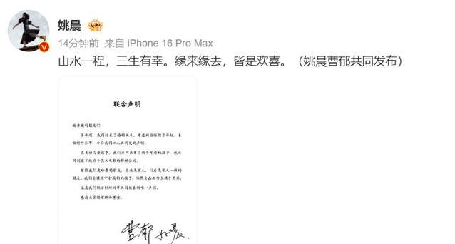 姚晨和曹郁在三月十六日共同发出声明,晓示他们其实多年前就狂妄了婚配相关。因为孩子其时还小,两东说念主遴荐不合外说,直到现时才公开这个事实。声明写得幽静和顺,用了山水一程,三生有幸,缘来缘去,王人是烦闷这么的话。两东说念主从一又友酿受室东说念主,以后照旧像家东说念主同样的一又友,链接一齐关切孩子,也在使命上相互维持。
