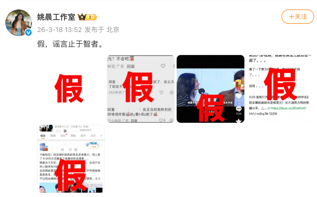 对此,今天(18日)中午,姚晨责任室发文“假,谣喙止于智者”,并连发五张图表明“假”,开云体育app辟谣“姚晨和侯雯元在沿途”“姚晨逼侯雯元和钟楚曦区别”等传闻。
