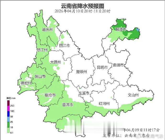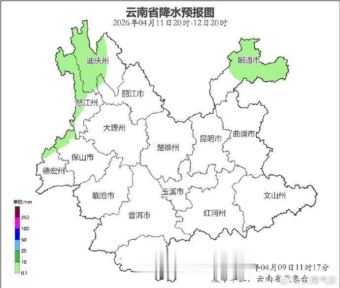 4月10日20时到4月11日20时:昭通市北部多云间阴有小到中雨局部大雨,迪庆州、怒江州、大理州西部、保山市、德宏州、临沧市、普洱市、西双版纳州、红河州南部、文山州南部多云有散列阵雨,其他地区晴间多云。
