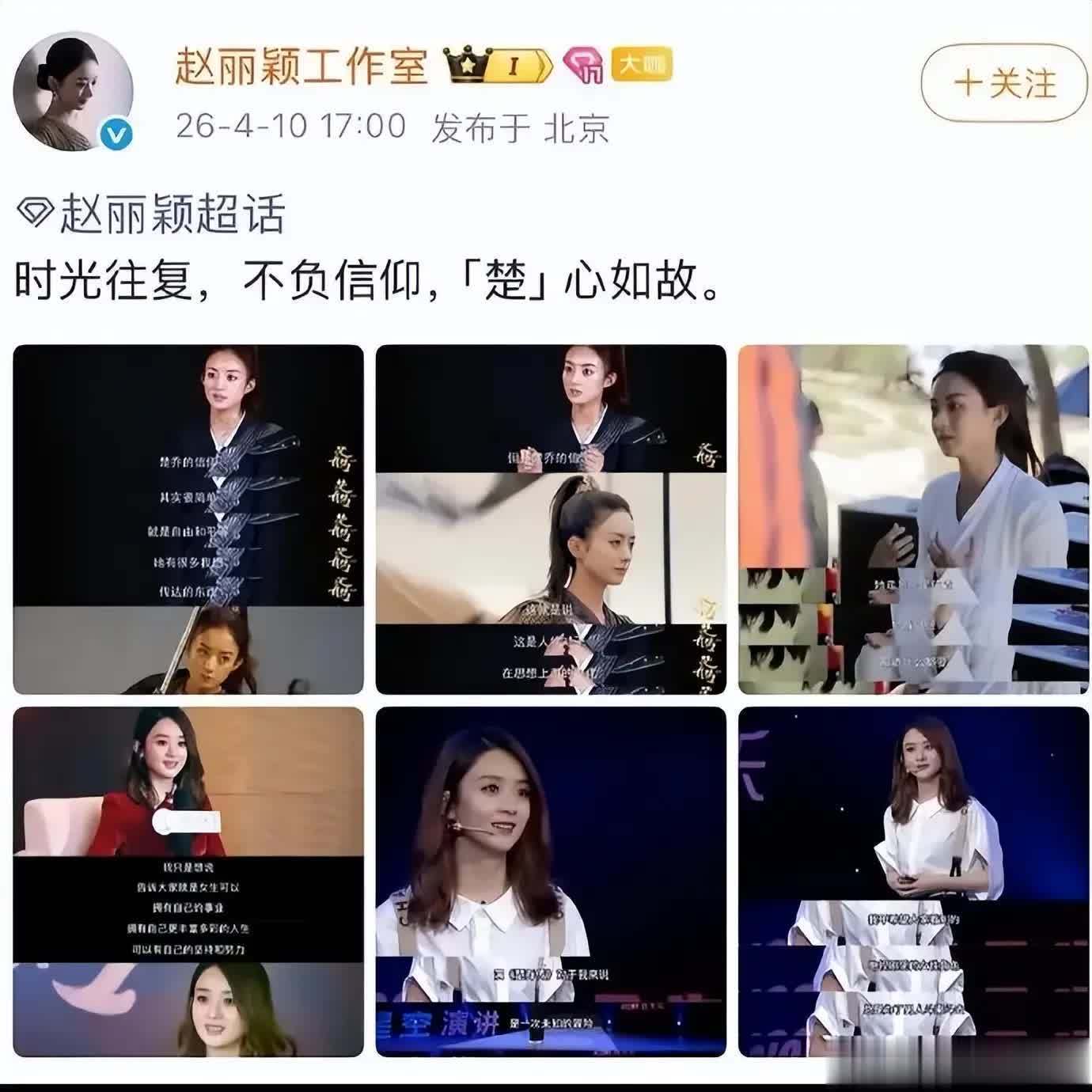 4月10日,赵丽颖发布楚乔战损剧照,配文"时光来去,不负信仰"并援用九年前采访,强调楚乔追求"开脱对等"的内核,被解读为对续作弱化变装精神的酬报。