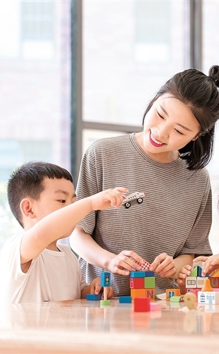 诚挚和孩子在幼儿园玩积木。光明图片/视觉中国