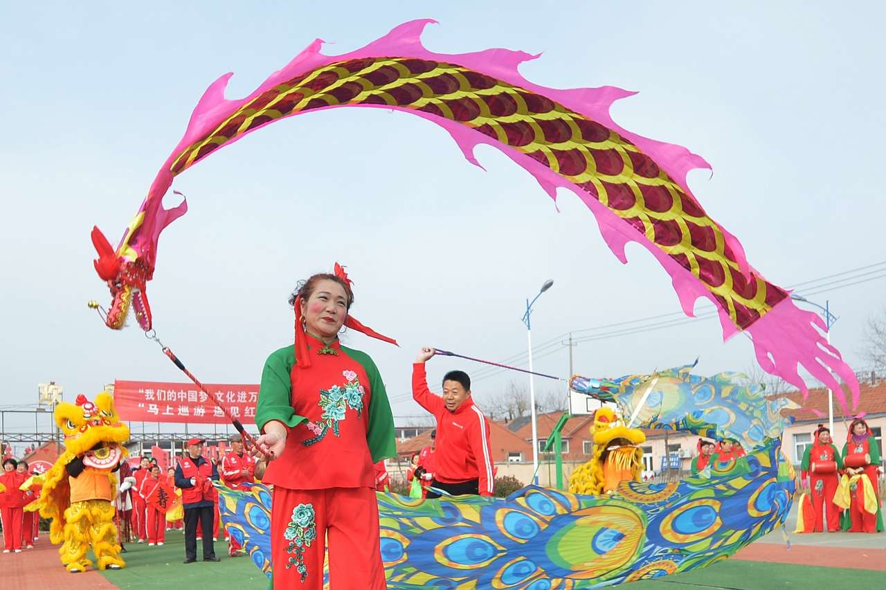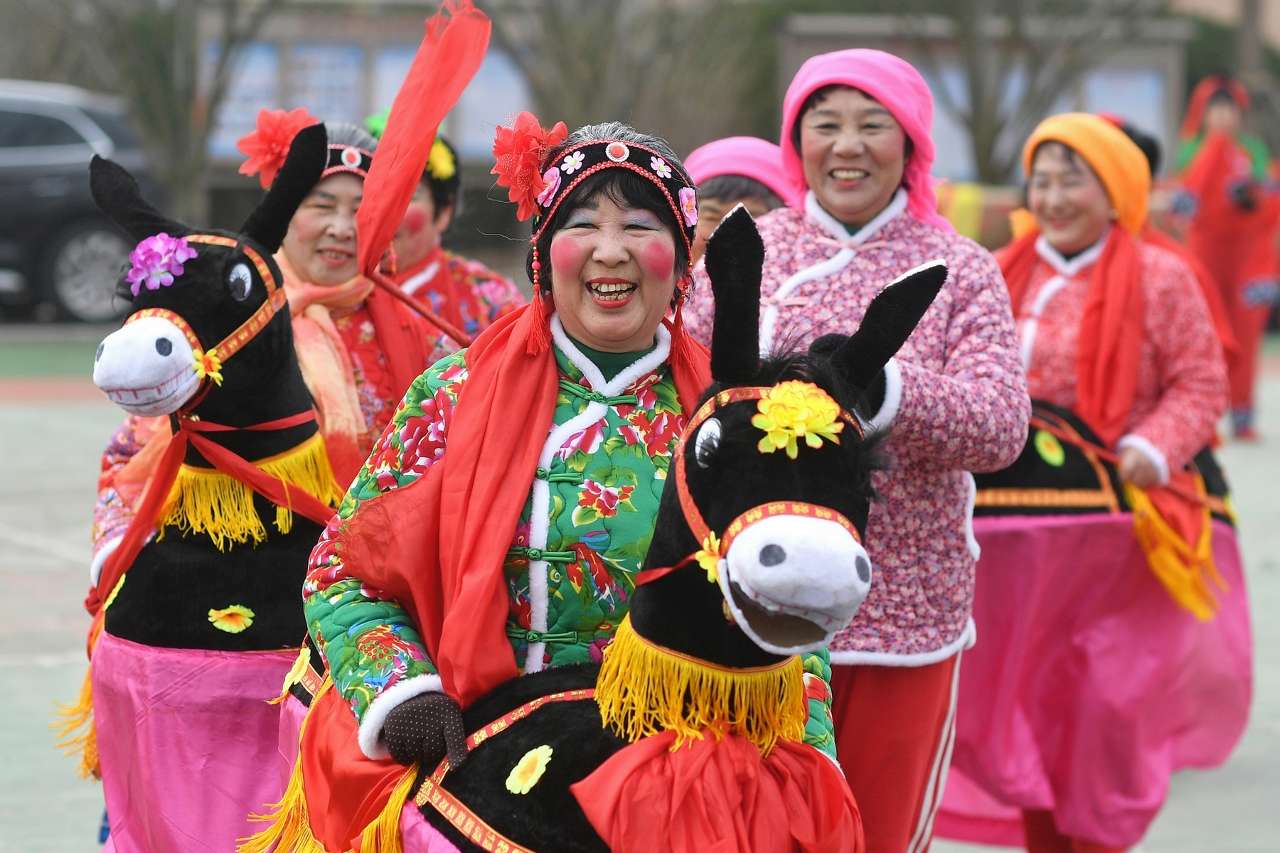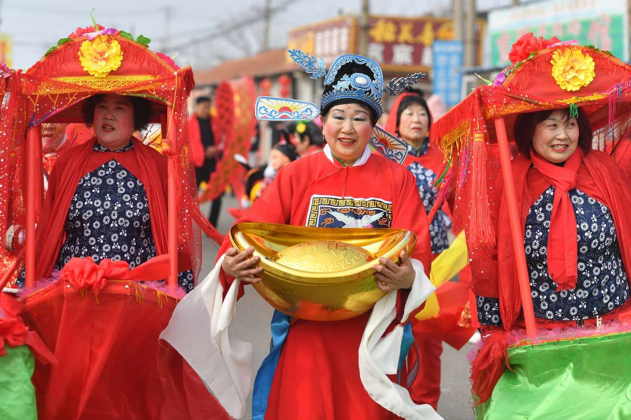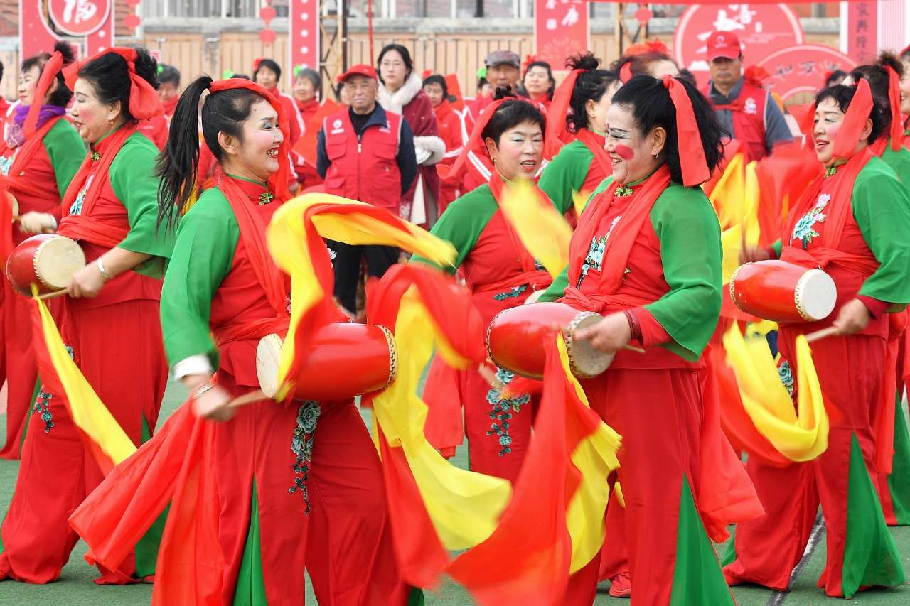 2月27日,在山东省青岛市城阳区红岛街说念宿流社区习尚巡游迎元宵行径上,住户们在演出饱读励。
