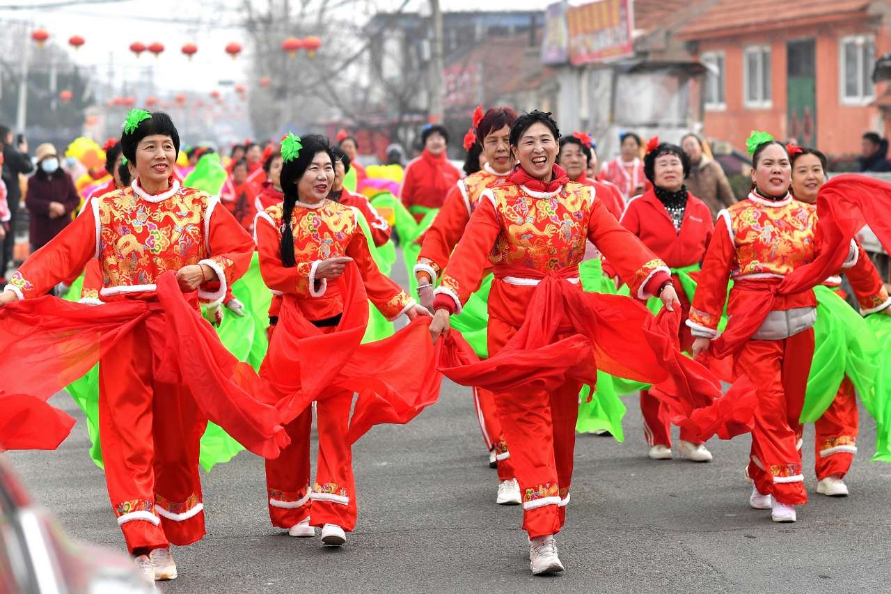 2月27日,在山东省青岛市城阳区红岛街说念宿流社区习尚巡游迎元宵行径上,住户们扭起秧歌闹新春。
