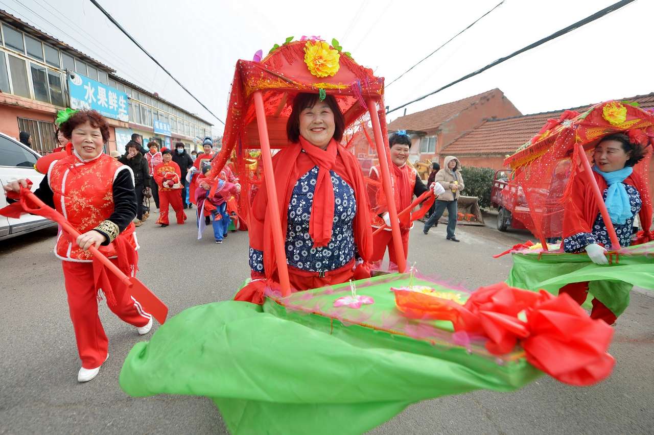 2月27日,在山东省青岛市城阳区红岛街说念宿流社区习尚巡游迎元宵行径上,住户在演出划旱船巡游。