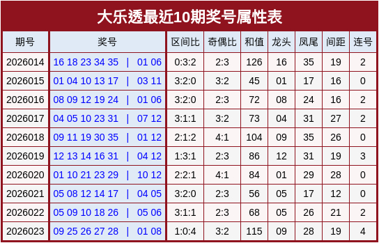 开奖回归:第26023期大乐透奖号为09 25 26 27 28 + 01、08。区间比:1:0:4,奇偶比:3:2,首尾间距:19。