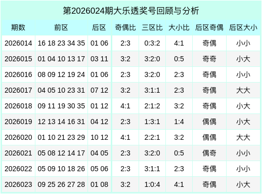 大乐透第26023期开出奖号:09、25、26、27、28 + 01、08。其中前区号码三区比为1:0:4,奇偶比为3:2,大小比为4:1,后区开极度数+偶数、少量+大数。