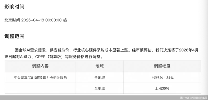 3月18日,阿里云与百度智能云销亡天告示加价。笔据官方公告,阿里云将对平头哥真武810E等算力卡磋磨处事、CPFS(智算版)等处事价钱进行编削,涨幅最高达34%;百度智能云则明确AI算力磋磨产物处事价钱上调约5%—30%,并行文献存储等价钱上调约30%。两家云厂商均将加价归因于“全球AI需求爆发”。