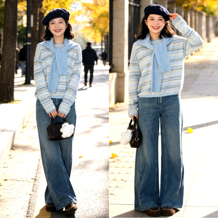 再比如,蓝色条纹毛衣搭配牛仔裤穿搭,造型如故很息争了。如果加多蓝色毛衣披肩,更有了看点,贝雷帽与包包呼应,全体搭配失业相沿有个性。
