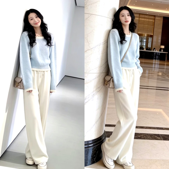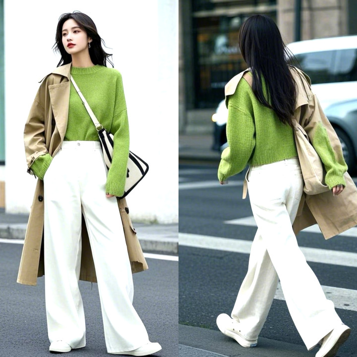 比如雾霾蓝毛衣,搭配白色融会阔腿裤,帆布鞋顺色蔓延,粗略腿部线条拉长到大地的视觉。白色拼接毛衣边,使造型档次变得更丰富,这么颓靡打扮走在街头,显高显瘦又泄漏减龄。