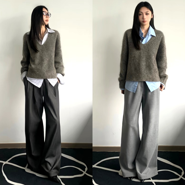 身处职场的女性,日常选拔灰色V领毛衣和灰色阔腿裤穿搭时,只须在毛衣底下叠穿一件白衬衫或蓝衬衫,透露衣领、袖子、下摆,瞬息冲破单调感。高跟鞋顺色蔓延,拉长腿部线条,利落高档有档次感。