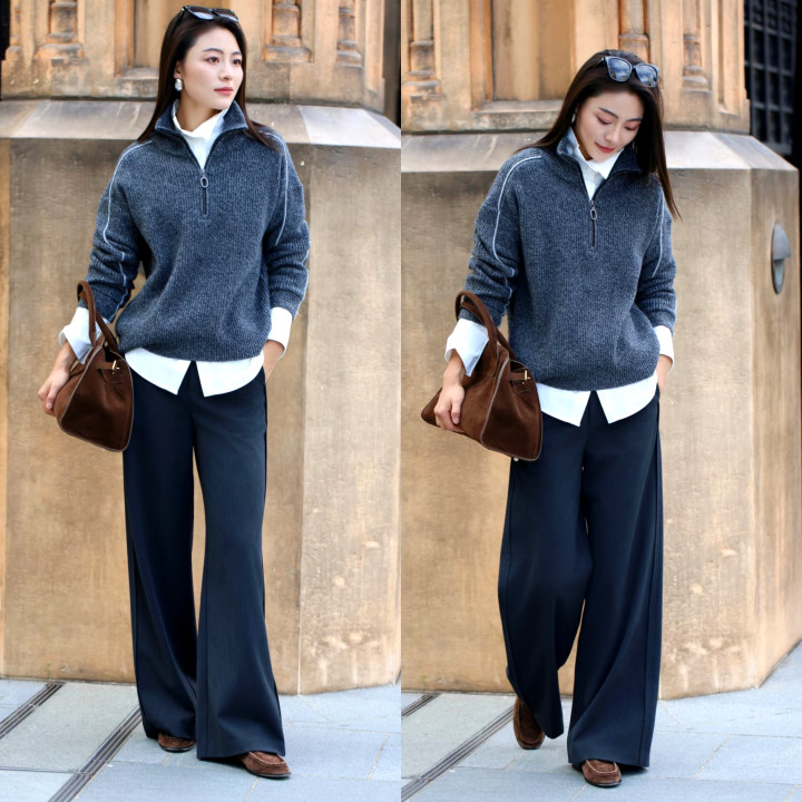 比如,灰色半拉链翻领毛衣,内搭白衬衫叠穿,毛衣袖子往上撸,透露衬衫袖口,与衣领和衣摆相互呼应,瞬息加多档次感,灰色阔腿裤与毛衣色系一致,全体搭配从简不节略。