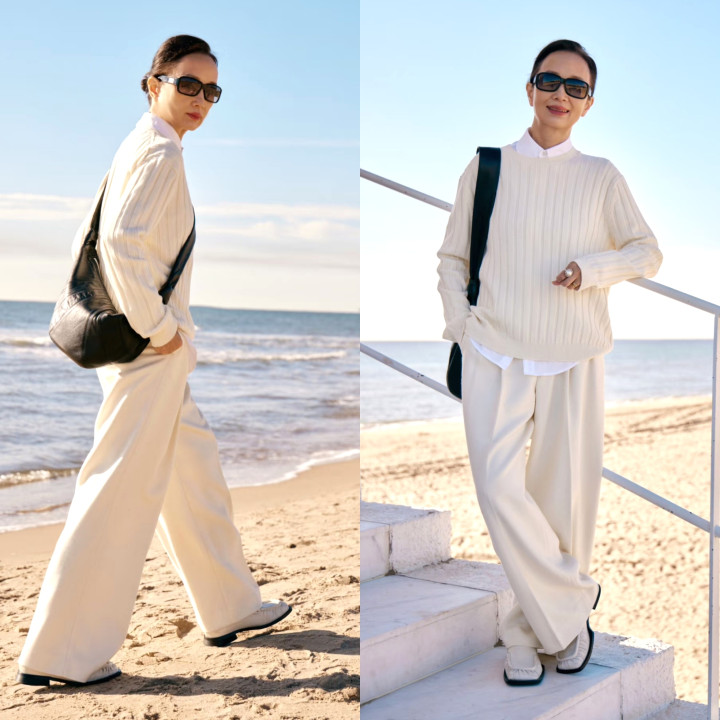 旅游出行:米色毛衣+米色阔腿裤+方头皮鞋