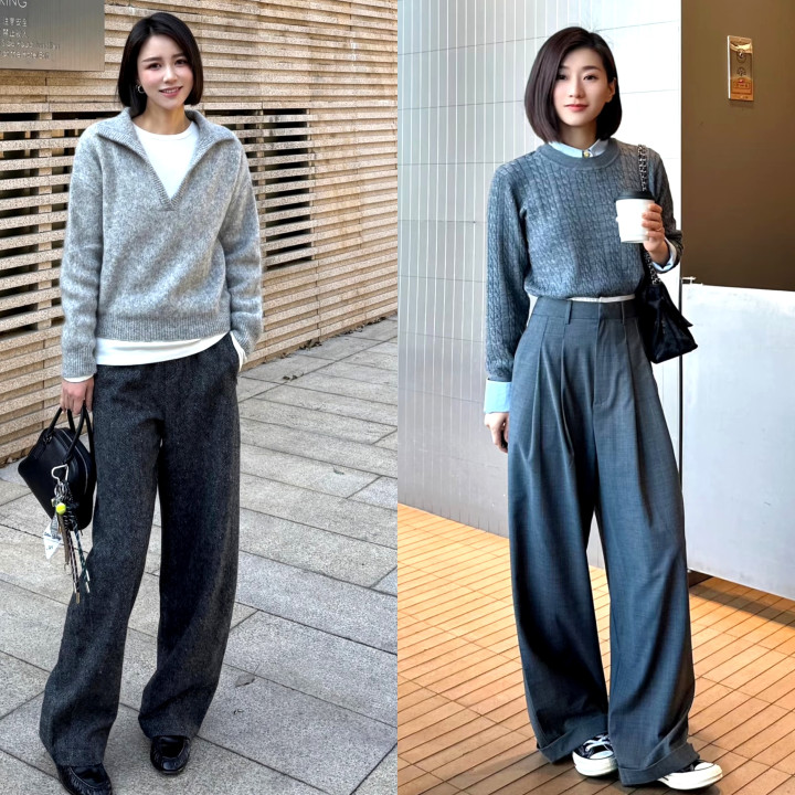 职场通勤:灰色毛衣+灰色阔腿裤+高跟鞋